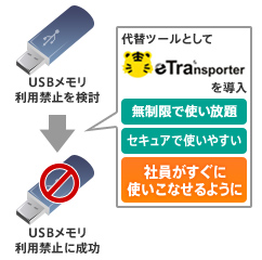 そのため、まず代替となるインフラを準備することが重要となる。では、USBメモリ利用禁止とファイル転送システムの導入をスムーズに進める方法を通販会社A社のケースで紹介しよう。