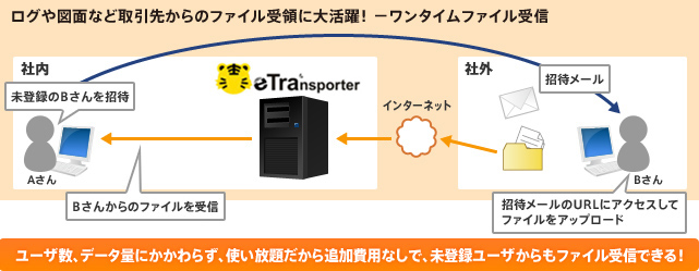 更に、eTransporterは未登録ユーザへのファイル送信はもちろん、未登録ユーザからeTransporter経由でファイルを受信することも可能。ユーザ数や利用量が増えても費用が変わらないeTransporterならではの特長を活かした機能により、社外への送信、社外からの受信、部門間での情報交換に活用する全社的なコミュニケーションインフラに適したシステムだと言える。