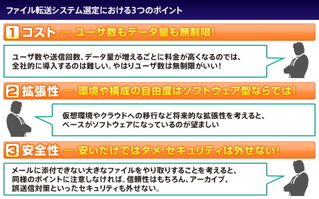 そこで、大規模企業で多く導入されているファイル転送システム「eTransporter」を紹介しよう。eTransporter導入ユーザから寄せられた選定ポイントを見てみると、「コスト」「拡張性」「セキュリティ」の3点が挙げられる。