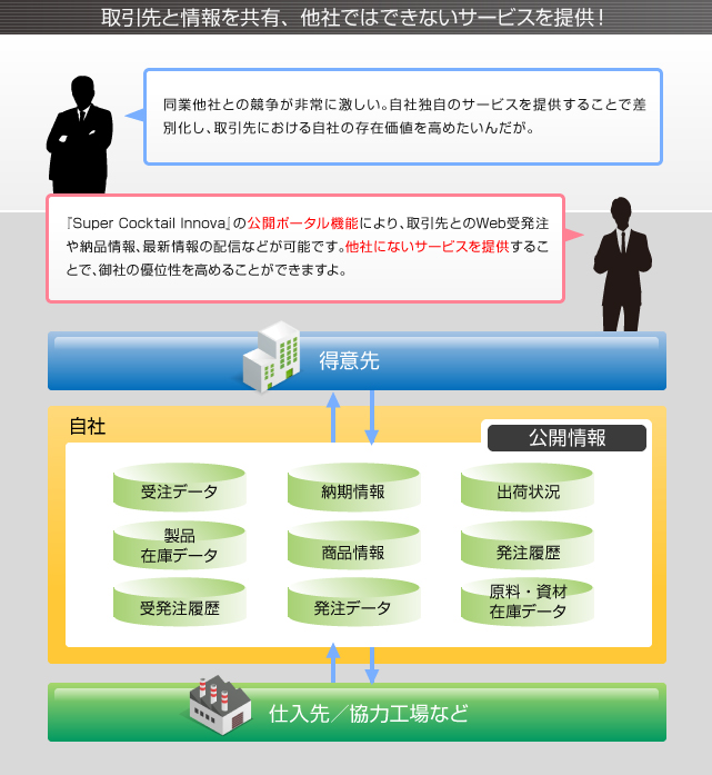 Super Cocktail Innovaの公開ポータル機能は、得意先にWeb発注画面を提供し、注文や納期回答を行うことで営業効率を向上させるもの。得意先がその顧客とやり取りするWeb画面まで用意できるので、顧客満足度が向上し、取引量の拡大も期待できる。また、仕入先と受発注のやりとりだけでなく、自社の在庫を共有して生産計画に役立ててもらうことも可能。これにより欠品が少なくなり、得意先への納品がスムーズになる。このように得意先への情報提供・サービス強化を行うことで、自社の付加価値・存在価値を高めることができる。
