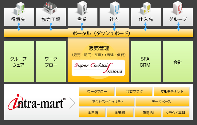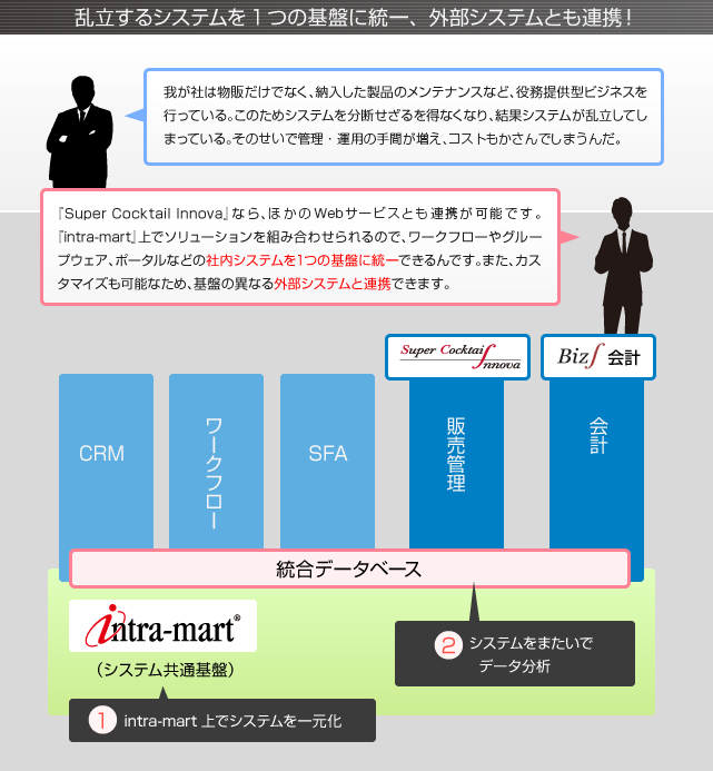 Super Cocktail Innovaは、2700社以上の企業で導入されているintra-martをベースにしており、柔軟かつ拡張性の高いシステム開発が可能。社内外の異なる基盤のシステムを1つの基盤に統一でき、運用の手間を大幅に削減できる。また、基盤上に共通マスタとして統合データベースを整備すれば、複数システムの横断的なデータ分析も容易に行えるため、経営判断を支援し、かつ変化する環境に対応できる柔軟性が得られる。
