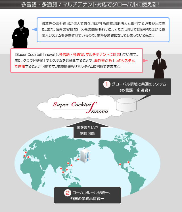 Super Cocktail Innovaは、多言語・多通貨に対応。マルチテナントにも対応しているので、海外拠点も含めてクラウド上でシステムを共通化できる。1つのシステムで運用でき、海外拠点の売上状況もリアルタイムに把握可能。拠点ごとにバラバラだったシステムを統一できるので、企業としてのガバナンスも強化。ローカルルールの統一や業務品質の均一化に効果的だ。