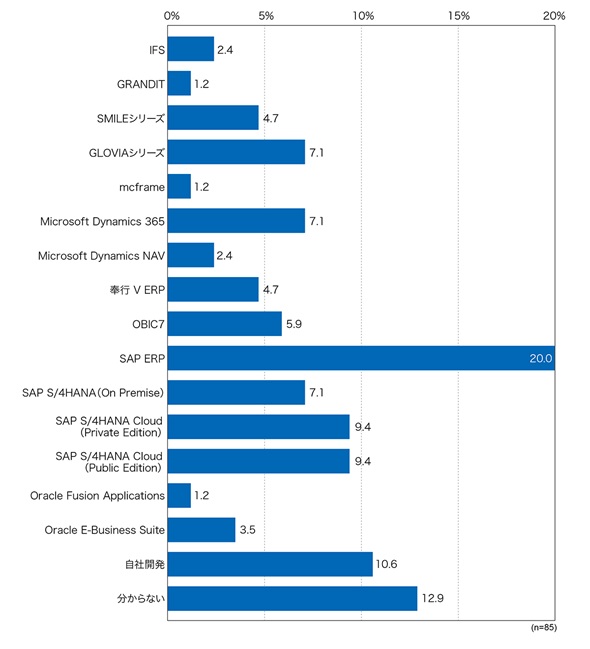 導入している製品やサービスとしては「SAP ERP」(20.0%)や「SAP S/4HANA Cloud(Private Edition)」(9.4%)、「SAP S/4HANA Cloud(Public Edition)」(9.4%)といったSAP製品が多く、「自社開発」(10.6%)も上位に挙がった(図2)。SAPのECC 6.0のサポート期間終了期日の2027年末が迫っているが、依然として導入率が最も高い。