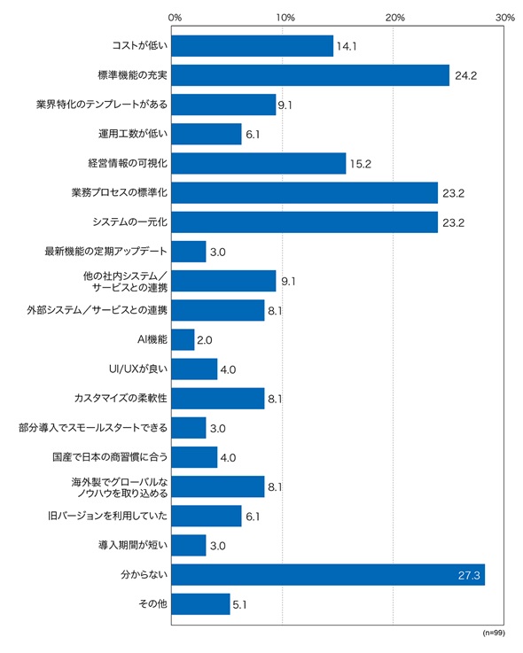 ERP製品選定時の重視ポイントは「標準機能の充実」(24.2%)や「業務プロセスの標準化」(23.2%)、「システムの一元化」(23.2%)、「経営情報の可視化」(15.2%)が上位に続いた(図3)。