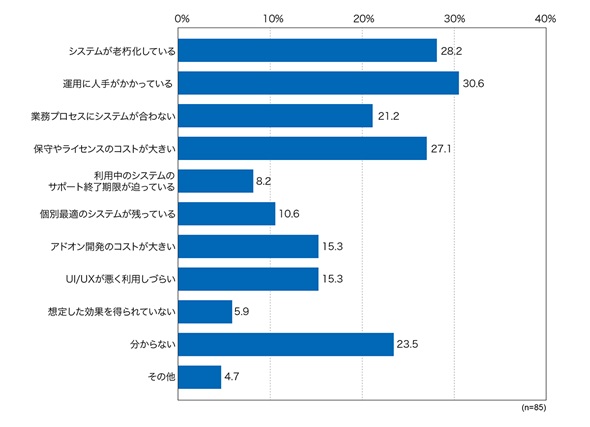 3つ目はコストの高さに対する不満で、「運用保守コスト。バージョンアップ費用が高額」や「毎年ライセンス費用が値上がりする」のように、運用コストの高騰に頭を抱える企業も少なくないようだ。一部「システムが老朽化している」や「導入後30年近くで古い」といったケースもあり、運用コストがかさむ要因にもなっている。