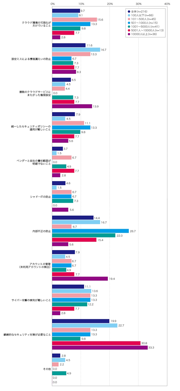 この結果を従業員規模別に見ると、従業員数1万人超の大企業では、「未利用アカウントの検出」や「複数のクラウドサービスにまたがる権限設定」など、従業員数の多さに起因する課題が目立った。一方で中堅・中小企業では、「クラウド環境の可視化が不十分であること」や「サイバー攻撃の検知が難しいこと」といった、クラウドの可視性や把握に関する課題が多く挙がっており、規模によって悩みの傾向が異なる。
