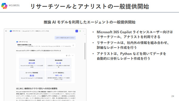 「リサーチツール」は、社内外の情報を統合し、詳細なレポートを自動生成するリサーチ支援エージェントだ。「アナリスト」は、Pythonなどを活用してデータを自動分析し、その結果を基にレポートを作成する、データ分析に特化したエージェントだ。これらの機能は2025年6月に一般提供が開始され、多くのユーザーが高度なAI機能を日常業務に活用できるようになった。リサーチツールの利用イメージは「Microsoft 365 Copilotの“最短”RAG構築術 Azureでの完全カスタムも徹底解説」で詳細を紹介しているので、こちらも参考にしてほしい。
