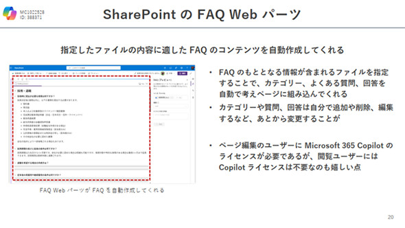 SharePointに、Copilotを活用した新機能「FAQ Webパーツ」がプレビュー版として追加された。就業規則や製品資料などのファイルを指定するだけで、内容に基づいたFAQを自動生成できるのが特長だ。カテゴリーの分類や質問の作成、回答の生成までを全て自動で行い、必要に応じて後から編集することも可能だ。ページの編集にはCopilotライセンスが必要だが、閲覧するだけであればライセンスは不要であり、実用性の高い機能と言える。
