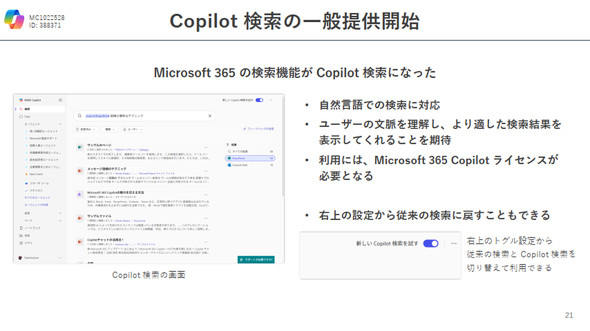 Microsoft 365の検索機能が「Copilot検索」として大幅に刷新された。従来のキーワード検索から進化し、自然言語による検索に対応した点が特徴だ。OneDriveに保存されたファイルの内容や、最近のメールのやりとりを基に、ユーザーの現在の業務内容を自動的に把握し、それに応じた最適な検索結果を提供する。利用にはMicrosoft 365 Copilotライセンスが必要であり、設定から従来の検索方法に戻すことも可能だ。現時点では検索精度に課題があるものの、今後のアップデートによる改善が期待されている。