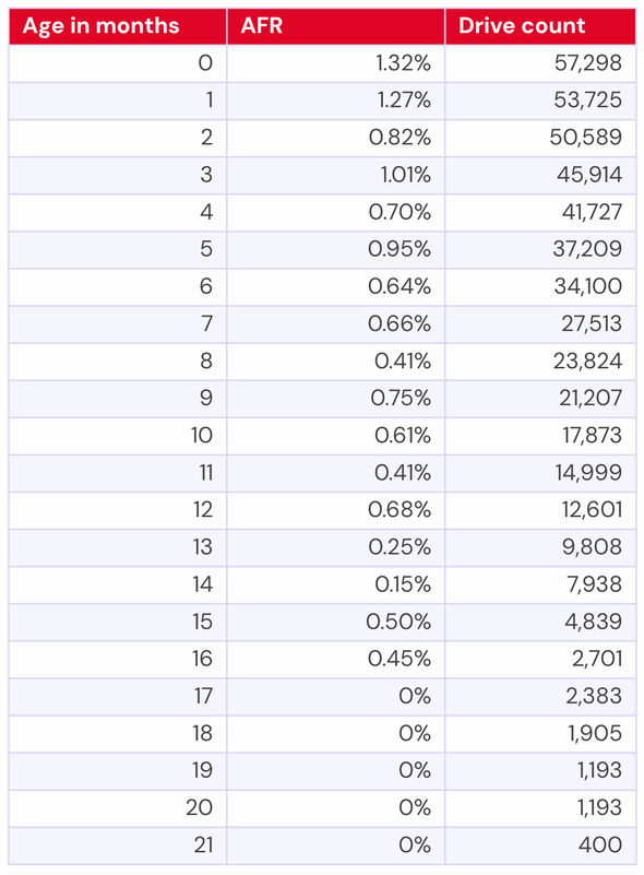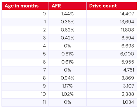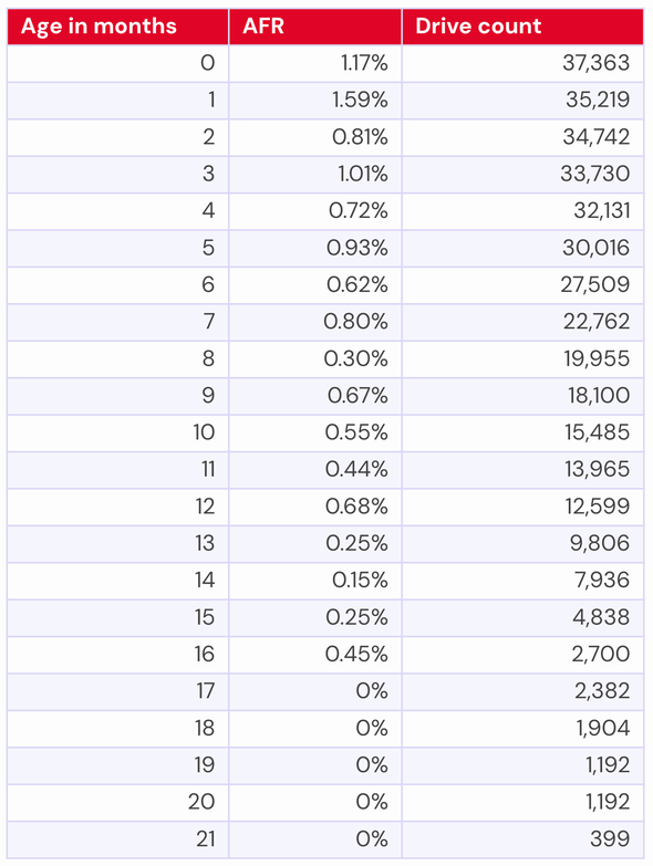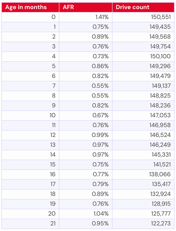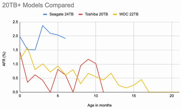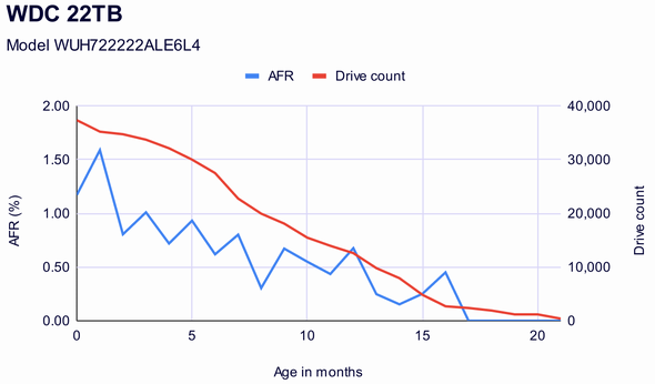 3社のモデルの比較以外にも分かることがある。それは22TBのWDCモデルが、全ての容量と稼働月数をまとめた現在のAFRを大幅に下回っていること、さらにデータ量が最も多いグループに属するため、それが見かけの値ではないことだ。