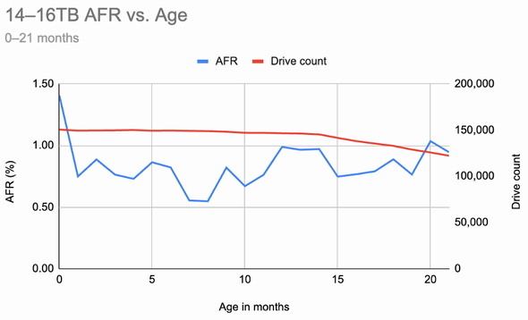 続いて21カ月を過ぎると14〜16TBのモデルのAFRがどうなったのかを見てみよう(図12)。