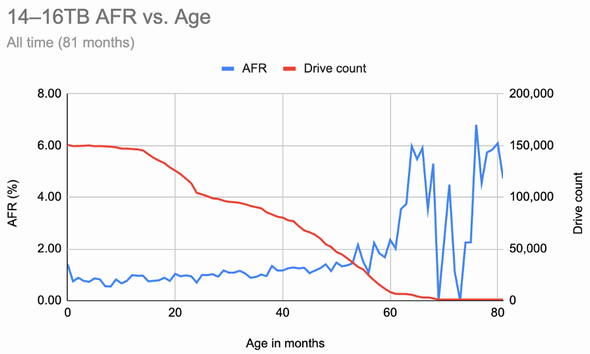 だが、他のモデルも稼働月数が増えたていくうちに、WDCモデルと同じようなAFRまで下がっていくかもしれない。Backblazeは稼働月数が多く、モデルの台数も十分な14〜16TBのモデルと比較することで、そのような傾向があるかどうかを調べることにした。