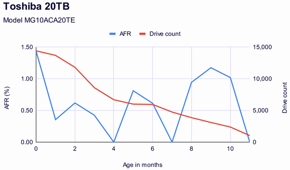 Backblazeは東芝「MG10ACA20TE」をこれまで22カ月運用してきたが、約1年前までドライブの台数はわずか2台だった。そのため、11カ月前からの評価を示す。