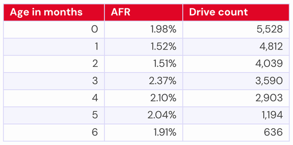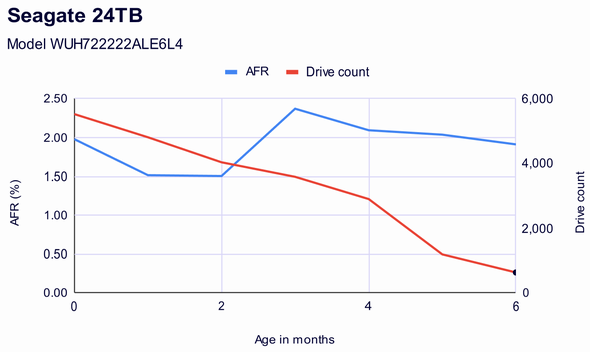 図5 Seagate「ST24000NM002H」(24TB)の統計データ 稼働月数(Age in months)ごとに平均故障率(AFR)とHDDの台数(Drive count)を示した(提供:Backblaze)東芝やWDCと比べて、Seagateの故障率が最も高いことは明らかだ。Backblazeはその理由をバスタブ曲線の初期故障期にあるためではないかと推測しており、今後も継続的に監視するとした。
