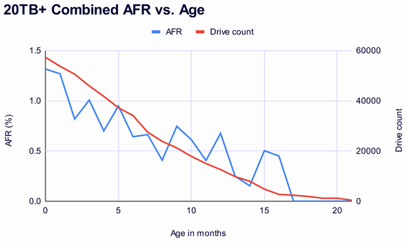図1 東芝「MG10ACA20TE」(20TB)の統計データ 稼働月数(Age in months)ごとに平均故障率(AFR)とHDDの台数(Drive count)を示した(提供:Backblaze)稼働月数をX軸においたグラフで図1の内容を表したものが図2だ。
