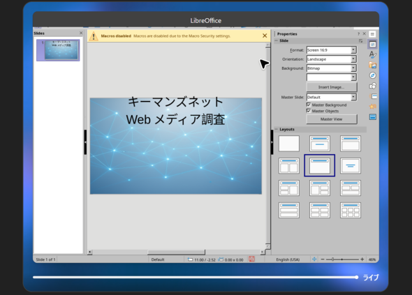 AIエージェントはまず、仮想PCでWebブラウザを開いてキーマンズネットについて調査しました。調査が終わると、LibreOfficeの「Impress」でファイルを作成し、PDFに変換して出力しましたが、24分もかかってしまい少し長く感じました。その間、別の作業を進めたり、たばこやコーヒー休憩を取れるほどの時間です。