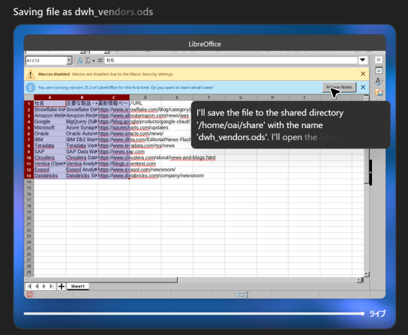 試しに、エージェントモードで「DWH関連製品やサービスを開発、提供するベンダーの一覧を作り、LibreOfficeのCalcでシートにまとめてください。項目は、社名、主要な製品・サービス名、プレスリリースもしくはブログなど最新情報を発信しているページのURLです」という指示を与えました。