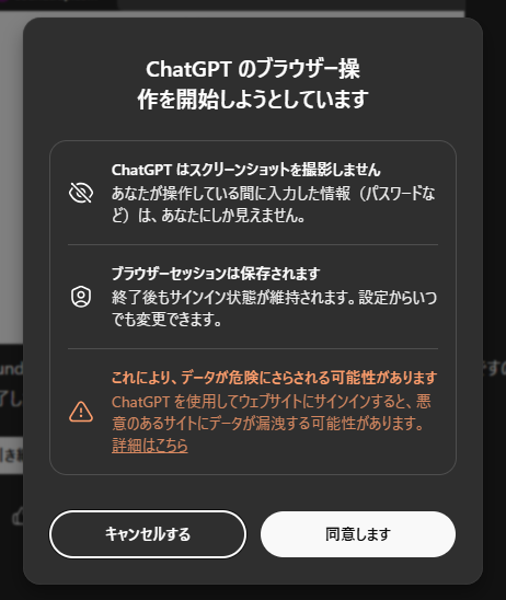また、AIの閲覧をブロックしているWebサイトにアクセスできない問題もあります。メディアなどは自社のコンテンツを守るため、ChatGPTを含む生成AIサービスのクローラがWebページにアクセスできないよう設定していることがあります。実際エージェントモードの動きを見ていると、よくページを読み込めない、アクセスできないというエラーが発生しています。エージェントモードでは出力までに数十分かかることも多いですが、そのほとんどはインターネットで検索してWebページを読み込めないで次に行く時間のようです。