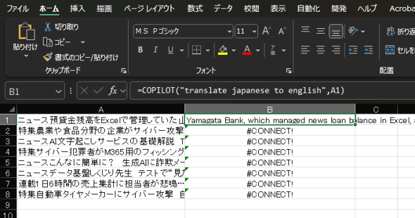 すると、B1セルに英訳された記事タイトルが出力されます。B1でオートフィルすれば、全ての記事の英訳タイトルが一瞬で示されます。生成にはラグがありますが、スピードは気になるほどではない印象です。ただし、生成回数には制限があり、10分間で100件以上Copilot関数を実行するとエラー表示「#CONNECT!」が表示されます。