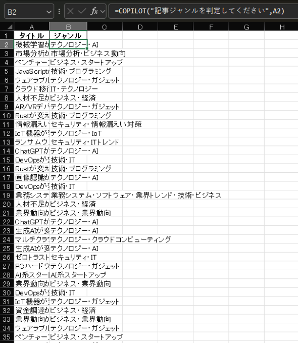 今度は、サンプルとして用意した架空の記事タイトルを50個用意して、Copilot関数で記事ジャンルを判定してみます。関数は「=COPILOT("記事ジャンルを判定してください",A1)」です。