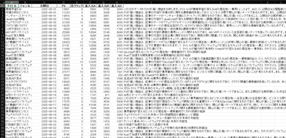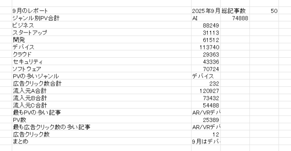 データを集計して一覧にするとともに、まとめとして「9月はデバイス関連の記事が特に人気で、PV数・広告クリック数ともに高い傾向が見られました。AIやビジネスも注目されており、流入元Aが最も多い流入経路となっています」というコメントも出力されました。簡易的なレポートとしては悪くないのではないでしょうか。
