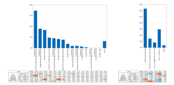 契約中のMicrosoft 365プランについては、「Microsoft 365 Business Standard(Teamsあり)」が34.2%と最多であり、「Business Basic(Teamsあり)」が17.7%、「Microsoft 365 E3」が16.5%と続いた。傾向としては、「Business Standard」「Business Basic」「Apps for business」「Business Premium」など、中堅・中小企業向けのビジネスプランに回答が集中している。これらのプランは価格と機能のバランスが良く、TeamsやExchange、SharePointなどの必要十分なアプリケーションがそろっていることから、多くの企業にとって導入のハードルが低いと言える。