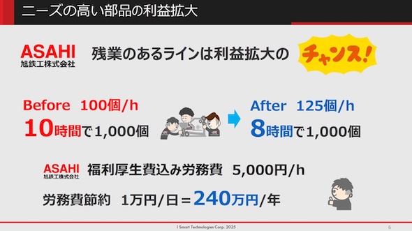 旭鉄工における改善とは、主に1時間当たりの製造能力の向上を指す。例えば、1時間で100個の製品を製造できる体制の場合、1000個の製品を製造するために10時間かかる。改善により1時間に125個を製造できるようになると、1000個の製品を製造するための時間が8時間に減少する。その結果、2時間分の残業代をはじめとする労務費や、生産能力が足りないことを理由とする設備投資が不要になり、これまでよりも少ない人数で生産できるようになる。