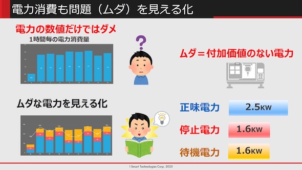そこで、半年以上かけてさまざまな切り口でデータを整理し、最終的に無駄な電力(付加価値のない電力)を見える化するという手法にたどり着いた。電力消費量のデータを、正味電力(生産時に使われる電力)と停止電力(トラブルで停止しているなどの際に発生している電力)、待機電力(生産の意図がない状況で発生している電力)に分けて表示できるようにしたのだ。こうするとムダな停止電力と待機電力を減らそう、となる。これが問題の見える化だ。