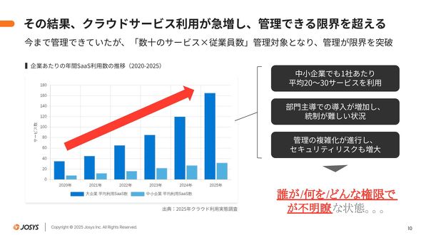 「コロナ禍の前後で、一企業当たりの年間SaaS利用数は数倍に増加している。そうした中、数十ものクラウドサービスにおいて従業員数分が管理対象となることで、以前は管理できていた限界値を突破している」