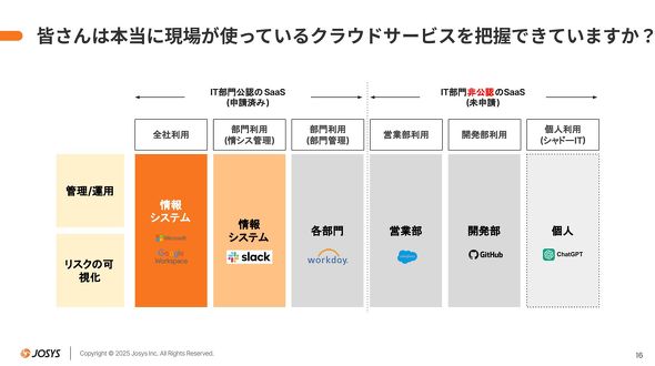 中島氏は、IT部門以外の各部門主導によるサービス導入が増加し、どのSaaSを誰がどのような権限で利用しているのかが不明瞭になってしまい、さらに生成AI利用が重なることで、IT利用管理が不可能になっていると指摘した。