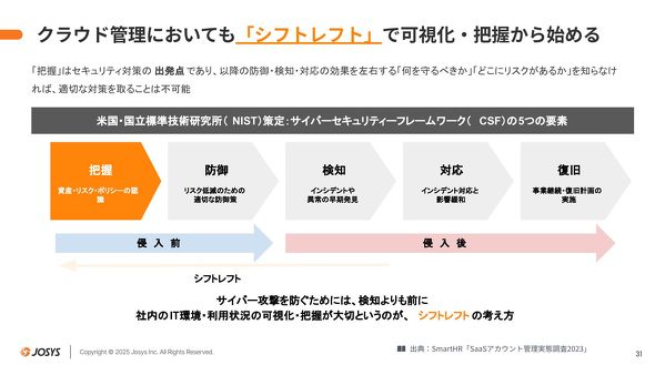 サイバーセキュリティフレームワークは、「把握」「防御」「検知」「対応」「復旧」の5つの要素で構成される。まず、どこから情報漏えいしそうなのかという「把握」から始めるという、検知よりも前にIT環境などの把握を行う「シフトレフト」の視点が非常に重要だ。