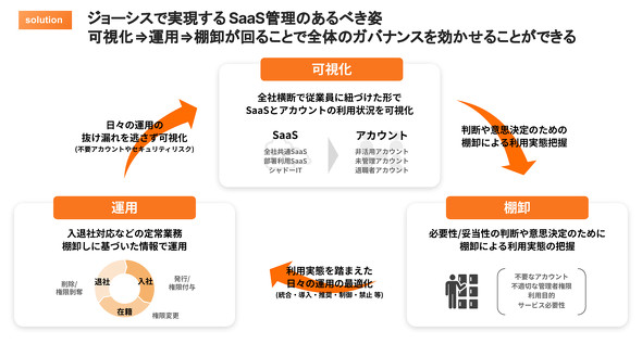 デバイスを中心とした管理であれば、情報システム部門や総務部門など、購買を担当する部署が全体像を把握しやすい。だが、SaaSは部署単位で容易に契約できるため、単に利用状況を可視化するだけでは不十分だ。定期的に棚卸しをし、日々の運用の中でリスクを評価した上で、必要に応じて利用制限を設けるなどの対応が求められる。