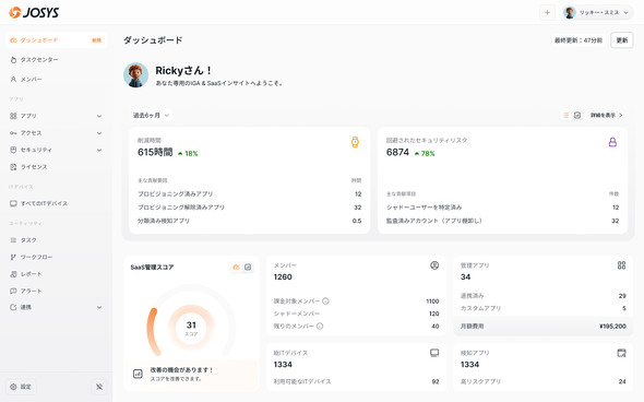 ここで、ジョーシスが提供するソリューションのダッシュボードを見てみよう。ジョーシスのソリューションは、ITデバイスからSaaSまで社内のIT資産を一元管理できるもので、SaaSやPCにインストールされたソフトウェア情報、保有するITデバイスの情報を、1つのダッシュボードで把握できる。