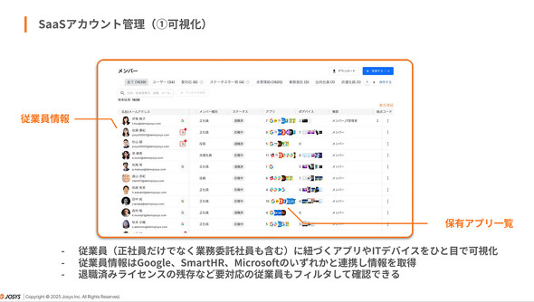 人事マスターと照合することで、退職者IDの把握はもちろん、アクセス権の付与状況を確認できる特権アカウントの可視化や、Slackなど外部委託先を招待する機会が多いサービスのアクセス権監視も可能になる。こうした情報漏えいリスクの排除に向けた可視化機能が充実していることが大きな特徴だ。