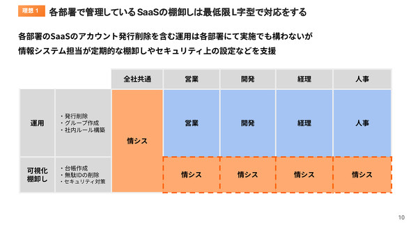 情報システム部門は、セキュリティや権限管理などの最小限の部分を確実に管理しつつ、定期的な棚卸やセキュリティ設定などの対策に介在できる環境を整備する必要がある。その意味で、運用は各部門に任せ、可視化や棚卸に関与する“L字型”の対応が求められる。
