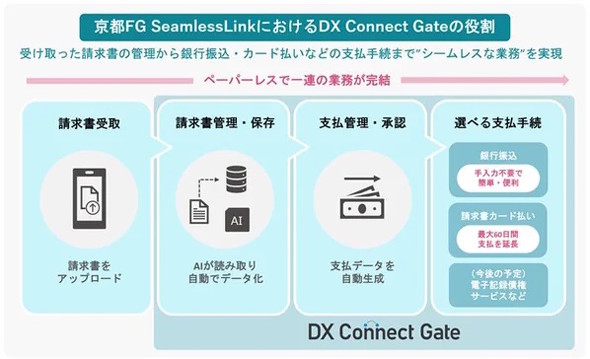 京都FG SeamlessLinkは、京都銀行による金融や決済領域の知見と、外部パートナーが持つ経理業務やシステム分野の知見を組み合わせ、請求書管理、経費精算、勤怠管理、資金決済などバックオフィス関連業務のデジタル化を支援するサービスだ。ここにTISのDX Connect Gateが加わることで、「請求書の受領から支払いまで」をデジタル化し、一元管理が可能になる。