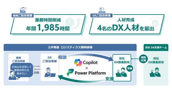 アルティウスリンクは2026年3月23日、三井物産のロジスティクス戦略部における生成AI(人工知能)活用の高度化およびDX(デジタルトランスフォーメーション)人材育成の支援事例を公開した。「Microsoft 365 Copilot」(以下、Copilot)と「Power Platform」を組み合わせた業務自動化によって、2026年3月期には年間1985時間の業務工数削減が見込まれている。