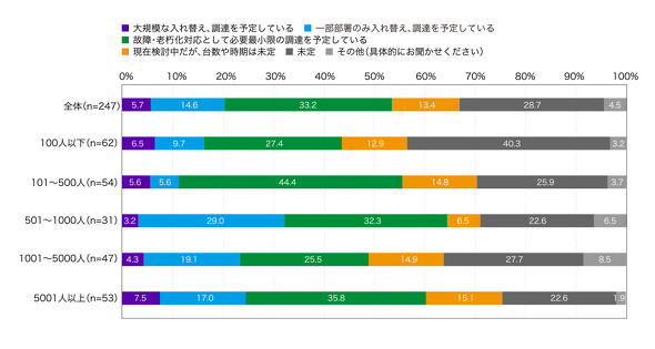この結果を業種別で見ると、IT製品販売や受託開発を行う「IT関連業」の約7割が調達を予定しており、従業員規模別では5001人を超える大企業群が約6割と、特に高い割合を示している。それらの企業では、今回の値上げラッシュの影響を直接受ける可能性が高い。