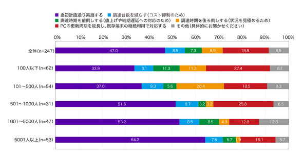 前出のように、PCの利用頻度が高い業種や規模の大きい企業群では「当初の計画通りに実施する」が高い傾向にあるが、そうでない企業においてはPCの更新周期を延長したり、調達時期を後ろ倒ししたりすることで、価格安定タイミングを見計らう方針を取るようだ。