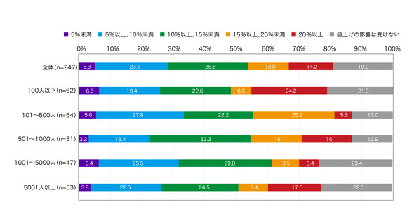 2025年と比較して予想される増額割合について聞いたところ、「値上げの影響は受けない」(19.0%)は2割以下で、「10%以上、15%未満」(25.5%)や「5%以上、10%未満」(23.1%)など、約半数が5〜15%の増額を予想した(図2-1)。特に、相対的に予算額が少ない中小企業群ほど調達コスト増加によるインパクトも大きいようで、従業員規模が小さくなるほど増額割合が大きくなる傾向だ。