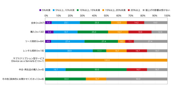 また、PCの調達方法によって、コストへの影響に差が生じることも分かった。調達方法別で増額割合を見ると、「値上げの影響は受けない」としたのは「購入」しているケースで12.9%であったのに対し、「リース契約」では27.4%と倍近くだった。
