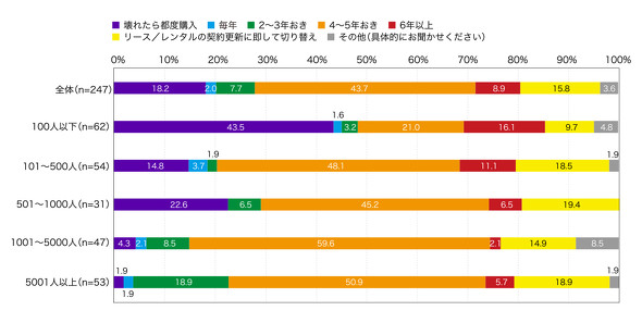 では、その前提となる、企業の業務用PCの更新周期はどのように設定されることが多いのか。調査の結果、「4〜5年おき」(43.7%)が最多で、「壊れたら都度購入」(18.2%)、「リース/レンタルの契約更新に即して切り替え」(15.8%)と続いた(図3)。税法で定められるPCの法定耐用年数が4年ということで会計が合理的なためか、全体の4割以上が「4〜5年おき」と答えた。また、多くのPCメーカーで提供している延長保守の最長期間が5年であることも要因と考えられる。