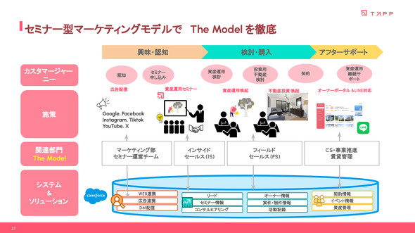 同社取締役の乾晋也氏は成功の要因について「テクノロジーを最大限に活用して独自のビジネスモデルを確立してきたこと」を挙げている。具体的には、投資初心者向けの資産形成セミナー「キャピタルハック」を運営し、これを起点に「The Model」型の営業プロセスを採用しているのだ。このプロセスでは、マーケティング部門による集客からインサイドセールス部門による参加者ニーズの深掘り、フィールドセールス部門による意思決定支援まで、各部門が統合されたデータに基づき連携する。