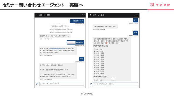 AIエージェントの開発はTAPPにとって初の試みだったが、およそ1カ月でリリースにこぎ着けた。笠原氏は短期間での開発に成功した最大の要因として、Salesforceにある強力なデータ基盤を活用できたことを挙げている。「Salesforceで持っているセミナーの予約日程が検索でき、日程変更やキャンセルなど、Salesforceレコードへのフラグ反映も自動化できるので、更新漏れがなくなった。リソース不足は解消し、セミナー担当者は顧客が最初に接触する人、企業の第一印象を決める重要ポジションという、本来の役割に集中できるようになった」(笠原氏)
