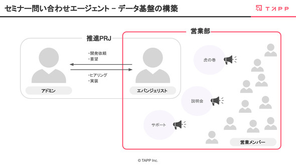 最も時間をかけたのがデータ文化の醸成、つまりデータ入力を行う営業メンバーとの関係構築だ。笠原氏自身は管理者の立場に徹し、営業メンバーを「社内エバンジェリスト」としてプロジェクトに巻き込み、虎の巻の制作や営業メンバーのサポートを一任した。これにより、「エバンジェリストが営業部の中から発信をすることで、受け取る側も納得感があって落とし込みが非常にスムーズになる」という効果が生まれた。