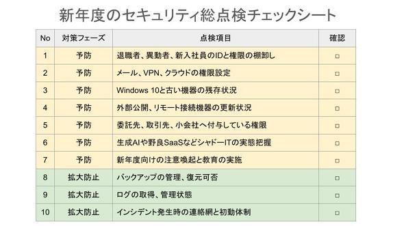 新年度は、新しい仕組みを入れるためのイベントではない。退職者ID、管理者権限、古い端末、公開機器、委託先、AI利用、バックアップ、連絡網といった放置しがちな実務を見直す節目と言える。全部を一気にやらなくてもいい。まずは事故の入口や運用の抜けになりやすいところから順番につぶし、その上で被害を広げない備えも整えていく。それだけでも、新年度のリスクはかなり減らせるだろう。
