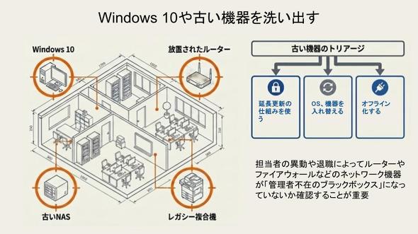 Windows以外で言えば、VPN装置、ルーター、NAS、ファイアウォール、複合機なども注意すべきだ。これらの機器は更新や置き換えが後回しになりやすい。特に、担当者の異動や退職で管理状況が曖昧になっている機器は危ない。Windows 10の残存確認をしつつ、古い機器についても洗い出しができるとよいだろう。