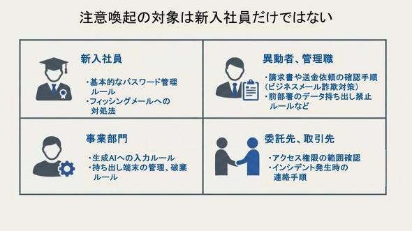 4月といえば新入社員教育だが、新入社員だけがリスクの起点ではない。異動者や管理職、委託先、現場部門も含めて、「新年度版の注意喚起」を更新する必要がある。例えば、請求書や送金依頼の確認手順、フィッシングメールへの対処、生成AIへの入力ルール、持ち出し端末の扱いなど、実務に直結する内容を改めて整備、周知することが重要だ。