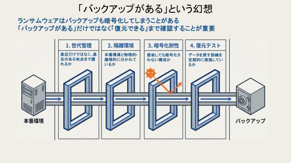 ランサムウェア対策で勘違いしがちなのが、「バックアップがあるから大丈夫」と考えてしまうことだ。だが、本当に重要なのは「必要なデータをしっかりと戻せるかどうか」だ。