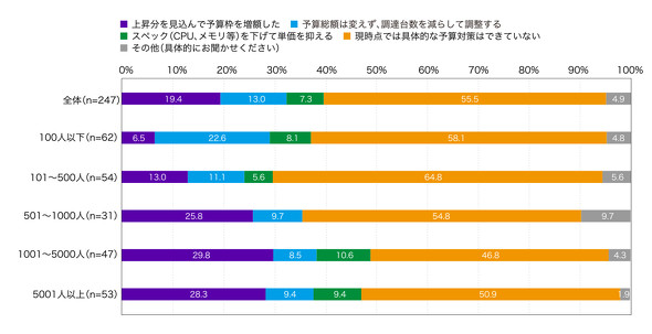 各メーカーが2026年に入ってから値上げに踏み切ったということもあり、まだ具体的な予算対策を立てられていない企業が多い。予算総額を変えずに調達台数の削減やスペックを落とす場合、旧PCやスペックが合わないPCを使い続けることによる生産性の低下やセキュリティリスクの増大にもつながりかねず、苦渋の選択を迫られている様子だ。